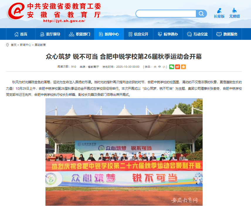 合肥中锐学校第26届秋季运动会精彩开幕式获安徽省教育厅官网专题报道