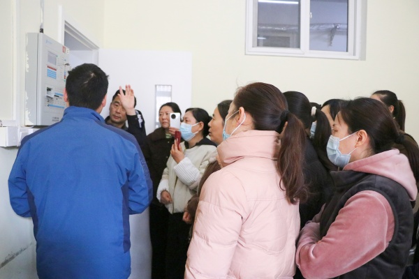 参训人员分批进入消防控制柜所在位置。技术人员现场演示了消防控制柜的基本功能,包括接收火警信号、识别报警分区等关键操作流程,强调了控制中心在火灾应急指挥中的核心枢纽作用及值班人员的职责。