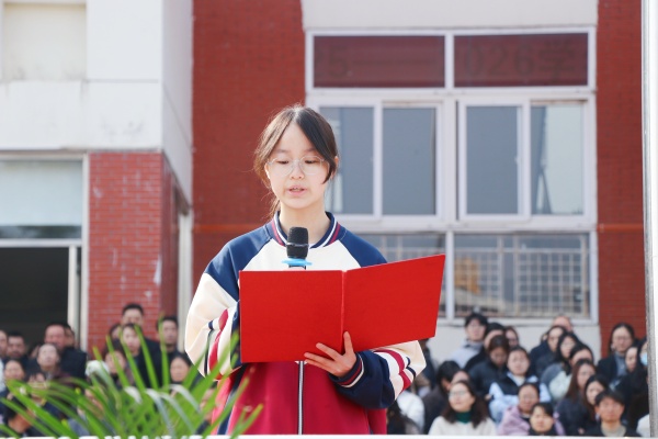 七年级(2)班的陈馨同学作为学生代表进行演讲。“春日的号角已经吹响。此刻,同学们站在崭新的起跑线上,冰雪消融处,正是少年策马扬鞭时!”她首先回顾了初入校园时老师们的悉心指引和同学们互帮互助、奋力拼搏的场景。老师们以爱与智慧默默耕耘,他们用“润物细无声”的关心关爱,滋润了每一名中锐学子的心田。同学们在良好的学习氛围中思考、提升,互相学习,共同成长。