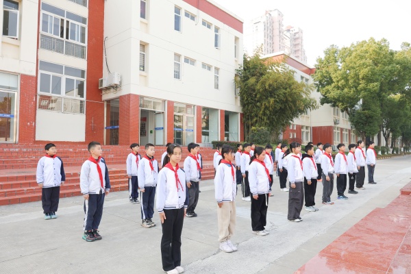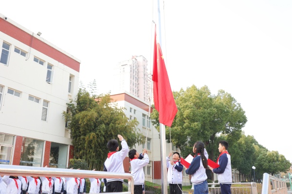升旗仪式在庄严的氛围中正式开始。升旗手徐钰博与护旗手汪子坤、赵鑫睿迈着整齐有力的步伐,护送国旗入场。全体师生面向国旗肃立,在激昂的国歌声中,注视着五星红旗冉冉升起。少先队员行队礼,现场庄严而肃穆。