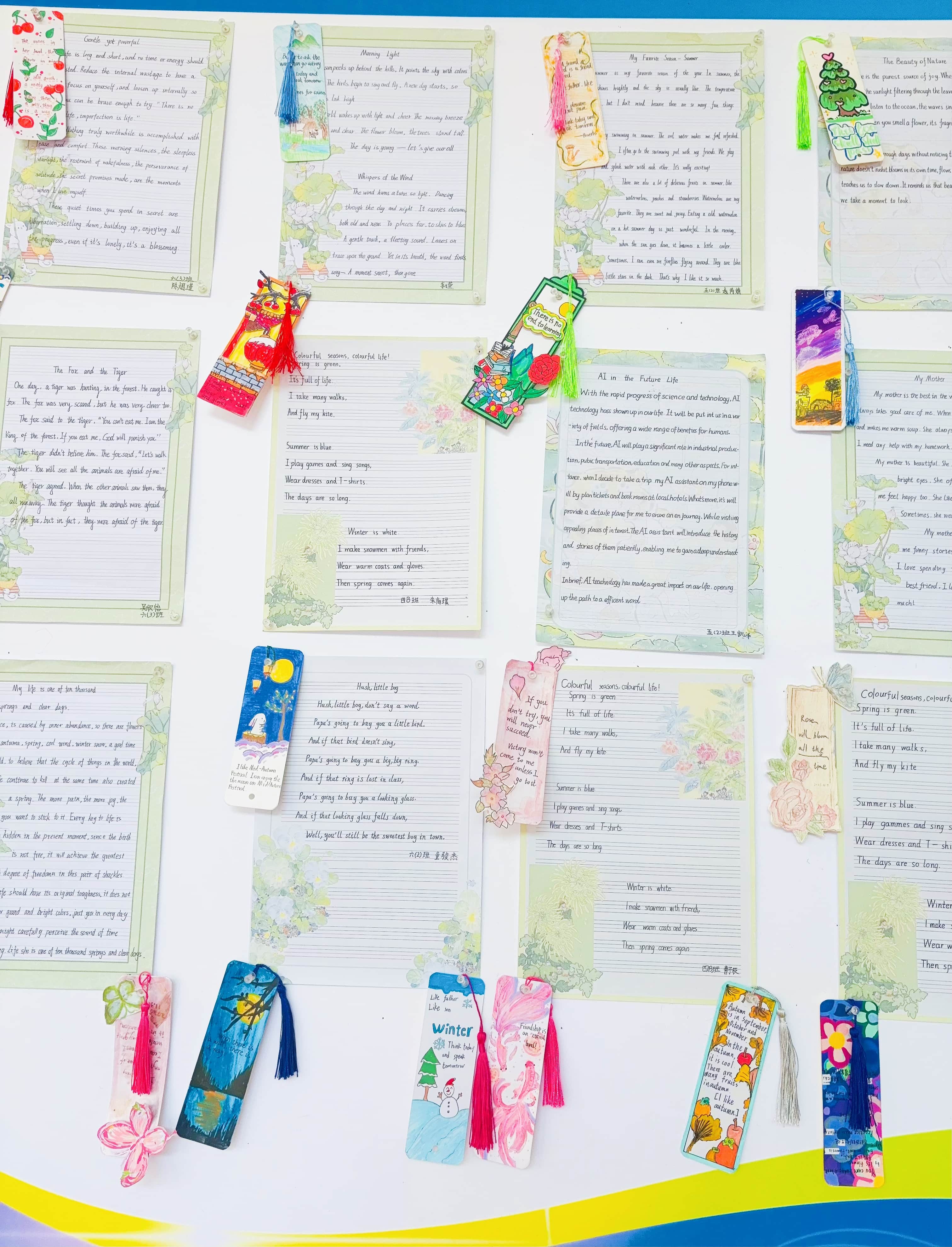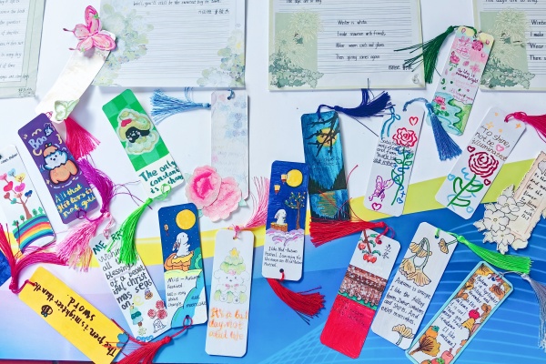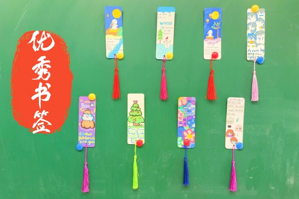 走进展览现场,琳琅满目的创意英文书签瞬间吸引了师生们的目光。孩子们化身小小设计师,他们充分发挥想象力与创造力,将自己对英语的理解融入书签制作中。卡通人物、花草鸟兽、星月宇宙等手绘图案生动可爱,搭配色彩鲜艳的卡纸、灵动飘逸的流苏,一张张小小的书签变得精致又独特。更亮眼的是,书签上都书写着工整的英文励志短句或经典单词,既装点了书签,又传递了知识。