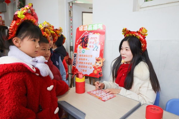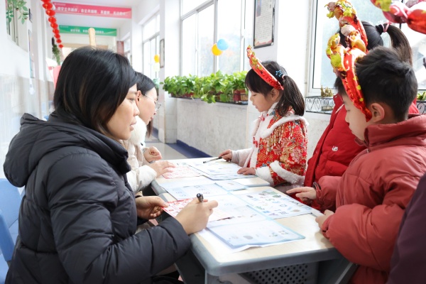 活动分为九个趣味站点,每站围绕学科核心素养设计挑战任务:语文类的“拼读糖葫芦”考验拼音与字词认读;“幸运大转盘”引导孩子们背诵古诗文;“说话迎福气”则通过看图说话锻炼表达与想象力;数学类的“算图红包雨”和“生活年货站”结合生活情境,考查计算能力与数学应用。此外,“英语如意角”鼓励学生开口说唱,“雅音贺新岁”展现音乐感知,“瑞春健体魄”挑战栏架跳跃,“画彩迎新春”则让孩子们尽情挥洒色彩创意。